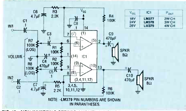 Este circuito com potências de saída de 2 a 3 W conforme a alimentação foi encontrado na revista Radio Electronics de abril de 1990. Os alto-falantes são de 8 ohms.