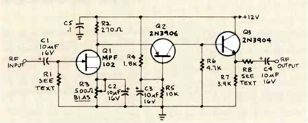 Este circuito para sinais de RF foi encontrado na revista Radio Electronics de março de 1987. Os transistores são de uso geral para frequência até 3 MHz. O circuito tem um ganho de aproximadamente 30 dB.