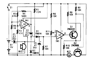 Esta sirene para alarme foi encontrada no volume 5 da Enciclopédia de Circuitos Eletrônicos de 1995. O circuito alimenta um buzzer.