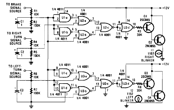 Este circuito para carros da época foi encontrado numa revista Popular Electronics dos anos 90. O circuito se baseia em lógica CMOS comum até em nossos dias.
