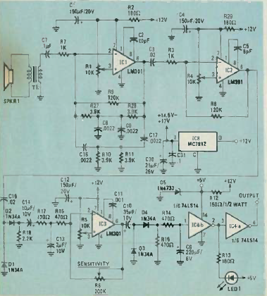 Este detector sônico foi publicado na revista Radio Electronics de 1984. Ele consiste num sensor de movimento em que um oscilador detecta variações da impedância ambiente.