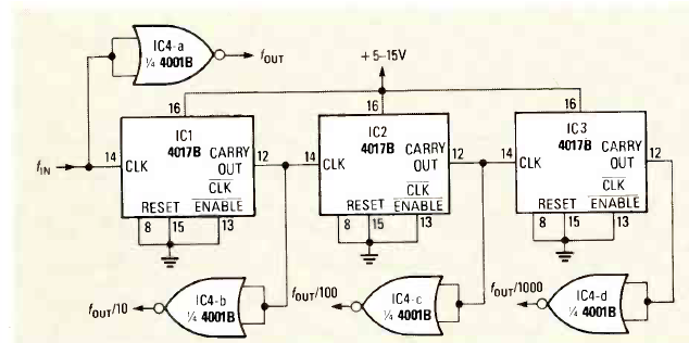 Com este circuito qualquer quantidade de integrados 4017 pode ser ligada em série. O circuito é de uma Radio Electronics de abril de 1989.