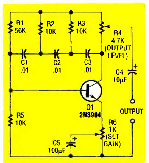 A rede formada prelos resistores e capacitores determina a frequência deste oscilador senoidal. O transistor é de uso geral e ele tem um ajuste do ponto de funcionamento.