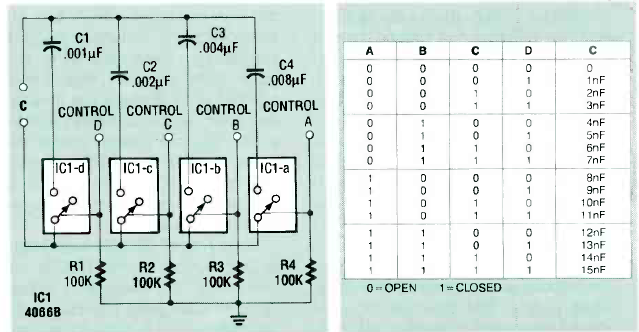 Na figura temos o modo de se obter uma capacitância digitalmente com chaves 4066. A tabela fornece as capacitâncias obtidas em função dos comandos digitais. O circuito é de uma Radio Electronics de novembro de 1989.