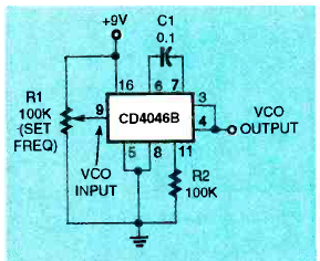 O PLL 4046 é pouco comum em nossos dias. Este circuito foi encontrado na revista Electronics Now de agosto de 1994. Ele opera de 0 a 1,4 kHz com ajuste da tensão no pino 9.