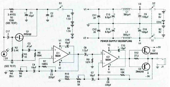 Este é o circuito receptor para o transmissor do circuito anterior ou outros do mesmo tipo. O circuito é do Electronics Experimenter Handbook de 1991. Recursos ópticos devem ser utilizados para maior sensibilidade.
