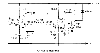 Este circuito com dois 555 foi encontrado na Enciclopédia de Circuitos Eletrônicos volume 5 de 1995. A potência e alta pelo uso do 2N3055.