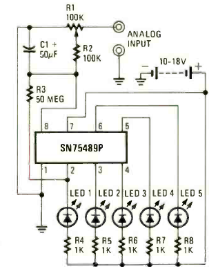 Encontramos este circuito na revista Radio Electronics de junho de 1978. Este circuito através da constante de tempo de R1 e R3 faz o LED1 piscar quando a entrada for menor que 200 mV.