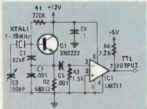 Este circuito compatível com lógica TTL foi encontrado na revista Radio Electronics de dezembro de 1986. O cristal determina a frequência do sinal produzido.