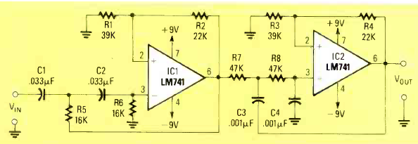 Este filtro de 300 Hz a 3,4 kHz foi encontrado na revista Radio Electronics de maio de 1989. O circuito exige fonte de alimentação simétrica.