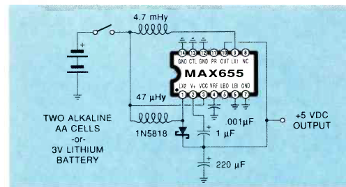 Esta microfonte a partir de baterias foi mostrada na revista Radio Electronics de 1991. A corrente máxima é de 170 mA e o circuito integrado é o MAX655 da Maxim.
