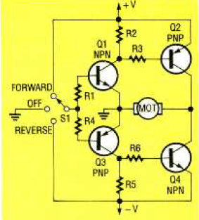 Este circuito utiliza uma chave para selecionar o sentido de rotação de um motor DC. Encontramos na revista Electronics Now de novembro de 1993. Observe o uso de fonte simétrica.