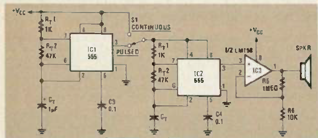 Este circuito opera de 25 a 65 kHz dependendo do transdutor usado e dos ajustes. Encontramos na revista Radio Electronics de julho de 1985. A fonte de alimentação de 9 V a 12 V não é dada.