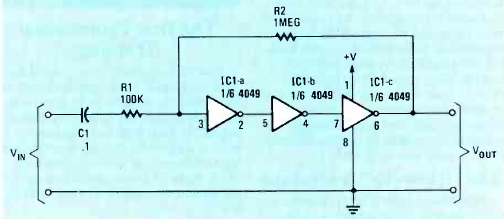 Na figura temos o modo de se usar inversores CMOS como amplificadores. O circuito é de uma Radio Electronics de abril de 1984. A tensão de alimentação pode ficar entre 3 e 12 V.