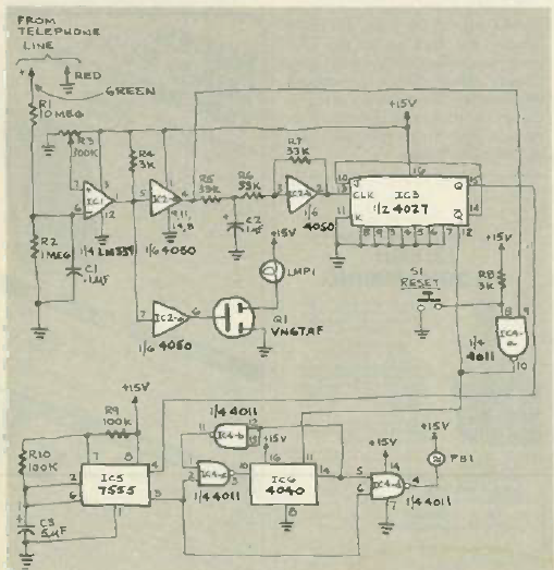 Este circuito para telefones antigos foi encontrado na revista Radio Electronics de julho de 1985. Ele ativa um alarme caso o telefone tenha sido esquecido fora do gancho.