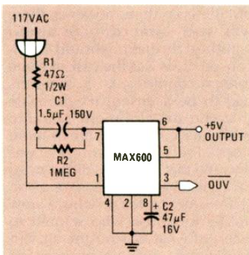 Este circuito para alimentar TTL e mesmo microcontroladores modernos é da revista Radio Electronics de fevereiro de 1987. Ele se baseia num circuito integrado da época.