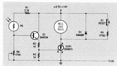 Este circuito de alta sensibilidade foi encontrado na revista Radio Electronics de julho de 1992. O circuito aciona um buzzer, mas pode ser usado um relé para ativar carga externa.