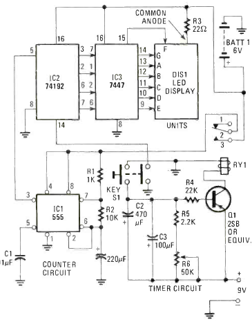 Este circuito com componentes comuns foi encontrado na Electronics Experimenter Special projects de 1983. O circuito tem um contador regressivo e aciona um relé.