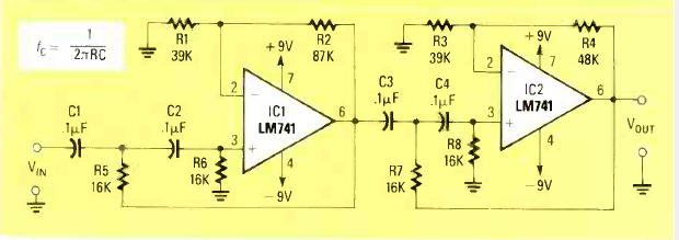Encontramos este circuito na revista Radio Electronics de maio de 1989. O circuito pode ter os valores alterados para operar em outras frequências e a fonte de alimentação deve ser simétrica.