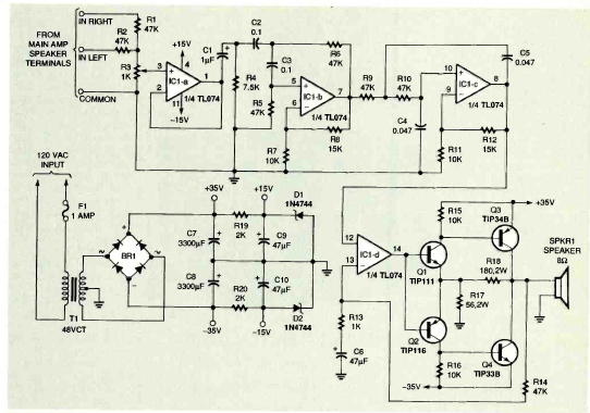 Este circuito saiu num artigo da revista Electronics Now de outubro de 1995. O circuito incljui fonte de alimentação. Os transistores de potência dmitem equivalentes.