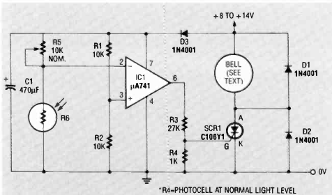 Este cirucito foi encontrado na revista Radio Electronics de julho de 1992. O circuito tem por base um 741 que aciona um buzzer com oscilador. R5 ajusta a sensibilidade.
