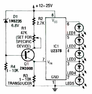 Este circuito foi encontrado na revista Radio Electronics de fevereiro de 1992. O circuito alimenta 5 LEDs a partir de um transdutor resistivo.