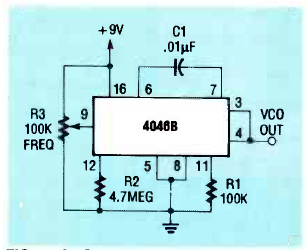 Utilizando o circuito integrado PLL 4046, este circuito gera sinais de 60 Hz a 1,4 kHz via R2. O circuito é de uma Radio Electronics de dezembro de 1989. C1 pode ser alterado para outras faixas de frequência.
