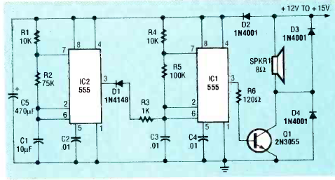 Este circuito é recomendado para sistemas de alarme já que possui uma etapa de saída com boa potência. O circuito é de uma revista Radio Electronics de outubro de 1992.