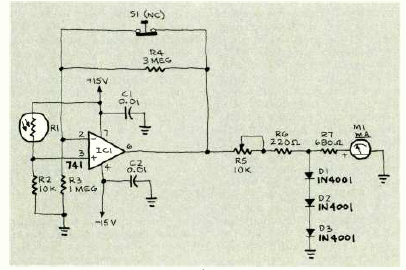 Este circuito foi encontrado na revista Radio Electronics de dezembro de 1983. O sensor é um LDR e a fonte de alimentação deve ser simétrica. Pode-se usar um multímetro comum em lugar do medidor analógico.