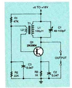 Encontramos este circuito na revista Electronics Now de já eiró de 1996. A frequência é dada basicamente por L1, ficando em torno de 1 MHz para a indutância indicada.