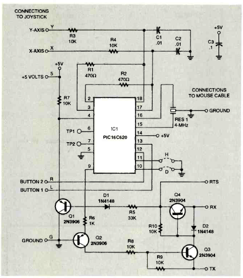 Este circuito de mouse foi encontrado na revista Electronics Now de janeiro de 1997. Ele faz uso de um PIC que deve ser programado de acordo com os movimentos.