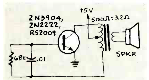 Encontrado na revista Radio Electronics de maio de 1982 este é um dos muitos circuitos semelhantes desta seção. O transformador é de saída para pequenos rádios e C1 determina a frequência do sinal assim como o resistor.