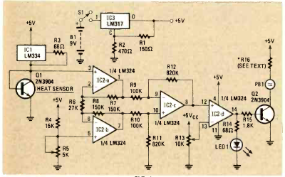 A finalidade deste detector de calor é encontrar pontos quentes numa placa ou em outros locais. O sensor é um integrado da época. O circuito é de uma Radio Electronics de maio de 1985.