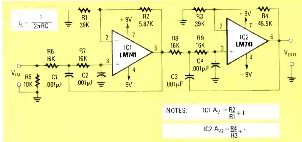 Este filtro foi encontrado na revista Radio Electronics de maio de 1989. Os componentes podem ser alterados para operação em outras frequências. A fonte deve ser simétrica.