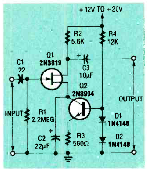Este circuito que combina um bipolar com qualquer JFET foi encontrado na revista Electronics Now de abril de 1993. Observe a tensão relativamente alta da alimentação.