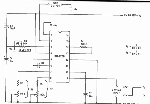 Este circuito para transmissão de dados de baixa frequência foi encontrado na revista Radio Electronics de maio de 1977. O circuito modula o sinal em duas frequências para os bits 0 e 1.