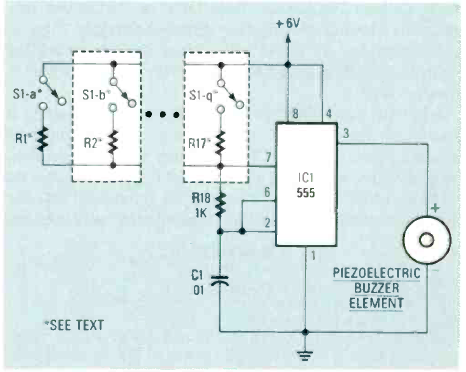 Este interessante circuito para montagem SMD saiu na revista Radio Electronics de novembro de 1987. Os fons são gerados por resistores escolhidos que são encaixados na montagem.