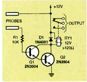 Quando as pontas de prova deste circuito entram em contato com a água, o relé fecha seus contatos. O circuito é de uma revista Electronics Now de maio de 1994.