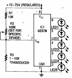 Este circuito com componente da época foi encontrado na revista Radio Electronics de fevereiro de 1992. O transdutor é resistivo e o ajuste feito no trimpot R2.