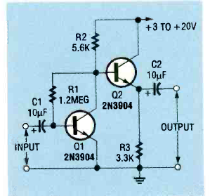 Este circuito foi encontrado na revista Electronics Now de novembro de 1993. O circuito de duas etapas utiliza transistores de uso geral.