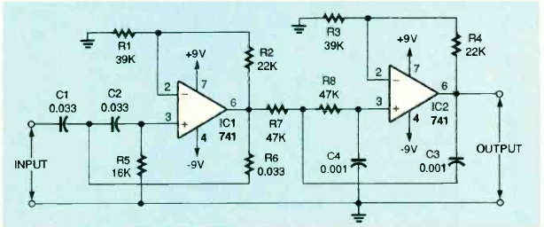 Este filtro para frequências de 300 Hz a 3,4 kHz foi encontrado na revista Radio Electronics de fevereiro de 1995. Outros operacionais podem ser experimentados e a fonte deve ser simétrica.