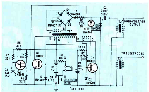 Esta defesa eletrônica gera uma descarga de alta tensão capaz de intimidar um agressor. O circuito foi encontrado na revista Radio Electronics Experimenter edição especial de 1990.