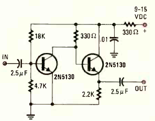 Encontrada na revista Radio Electronics de abril de 1980, esta etapa usa transistores da época. O circuito tem 6 dB de ganho em frequências até 50 MHz.