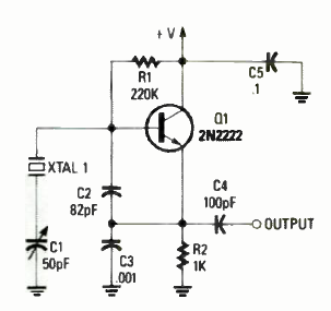 Encontrado na revista Radio Electronics de novembro de 1986, este circuito pode gerar siais de vários megahertz dependendo do cristal. O circuito admite transistores equivalentes.
