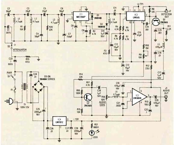 Diferentemente do anterior, este circuito se destina à recepção de sinais modulados em frequência transmitido pela rede de energia. O circuito é de uma Radio Electronics de fevereiro de 1989.