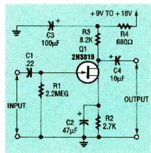 Qualquer JFET pode ser usado neste circuito sugerido pela revista Electronics Now de abril de 1993. O circuito tem alta impedância de saída.