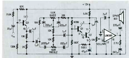 Este circuito de baixa potência foi encontrado na revista Radio Electronics de março de 1990. Ele consiste numa solução com controle de tom para toca-discos portáteis.
