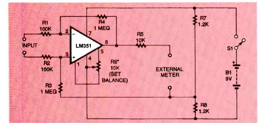 Este circuito pode ser utilizado em pontes de medida. Encontramos na revista Electronics Now de setembro de 1995. O medidor pode ser de 50 uA a 1 mA e a fonte de alimentação é simples.