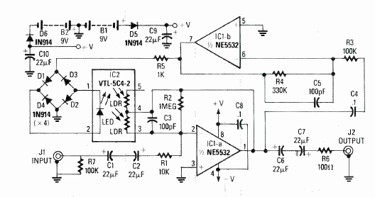 Encontramos este circuito na revista Radio Electronics Handbook edição especial de 1992. O circuito utiliza um acoplador óptico como potenciômetro eletrônico.