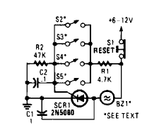 Este simples alarme com SCR dispara um buzzzer. Foi encontrado na Enciclopédia de Circuitos Eletrônicos Volume 5 de 1995. O circuito é alimentado por tensões de 6 a 12 V.